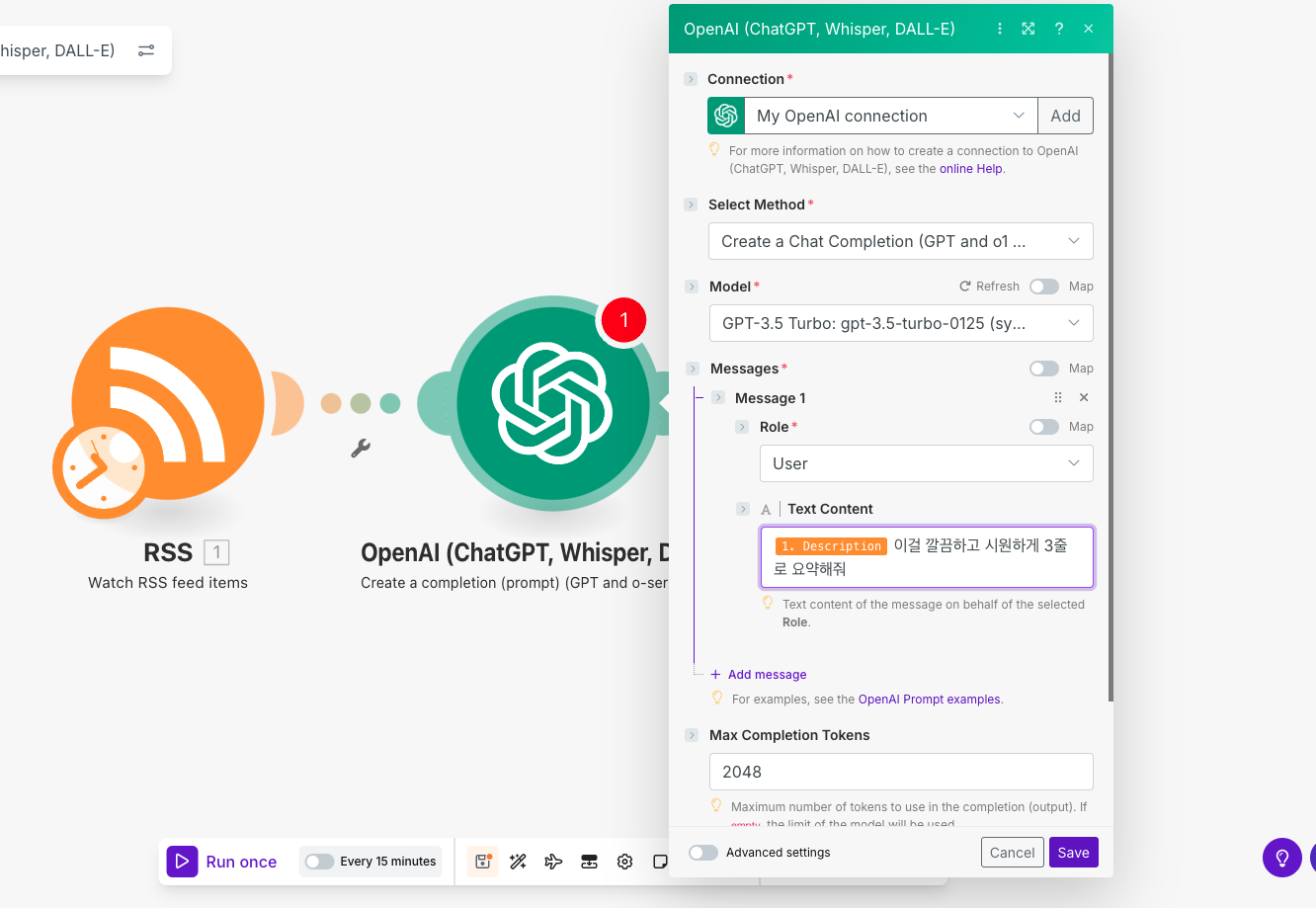 RSS에서 받은 데이터를 3줄 요약해서 받도록 프롬프트를 작성했다.