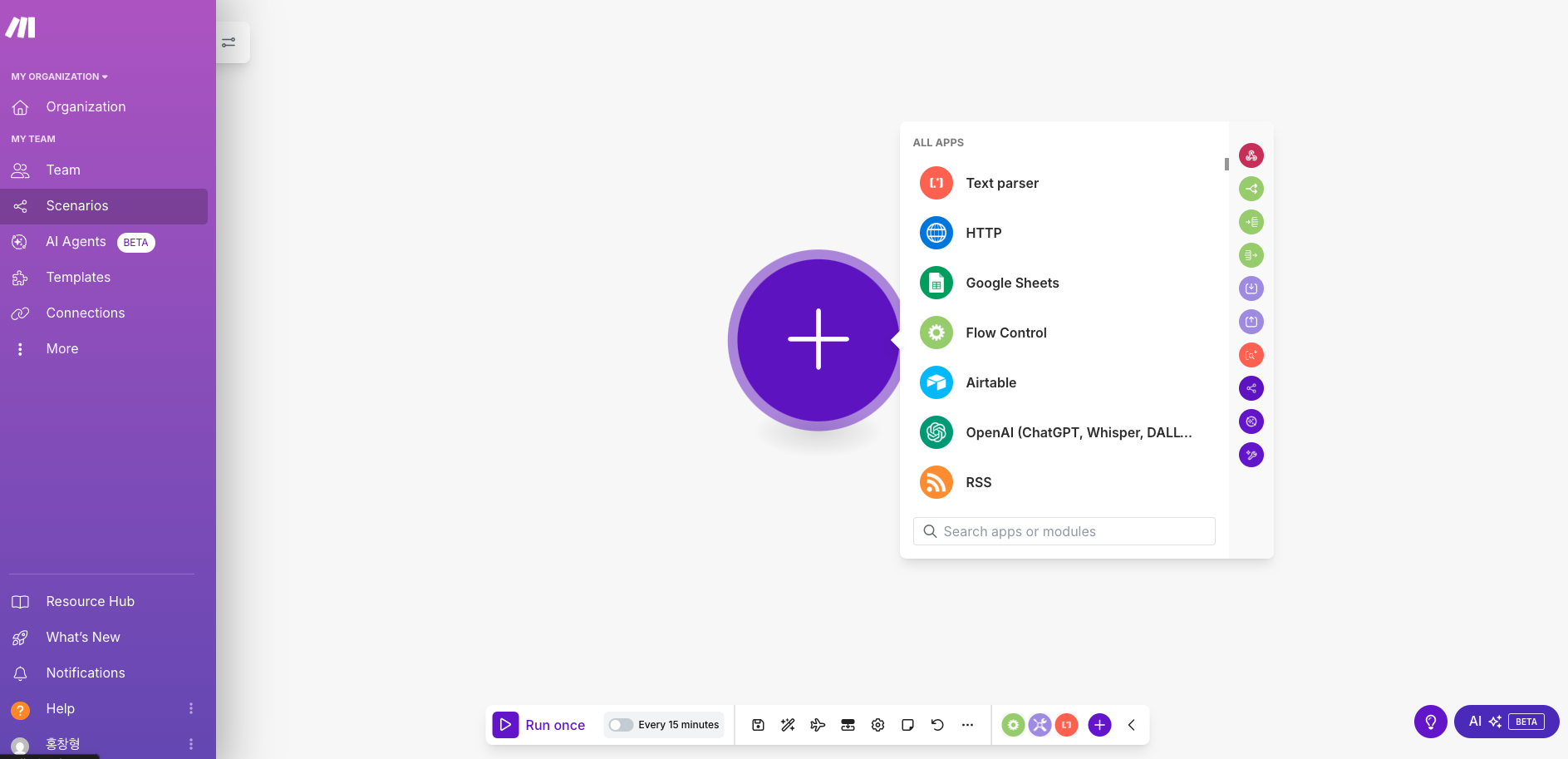 make.com은 좌측에 Scenario가 주된 기능으로,